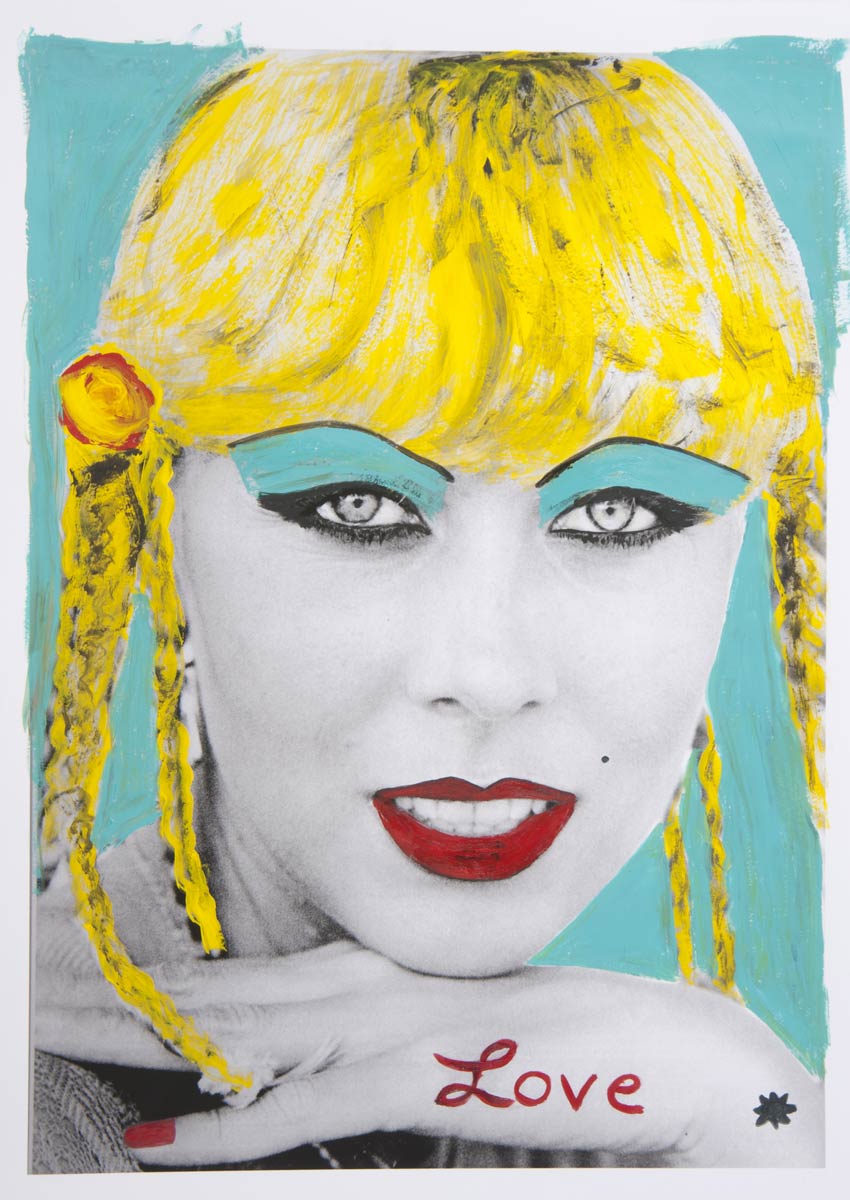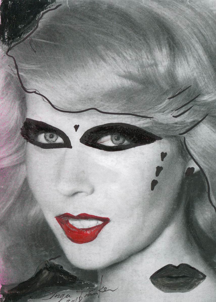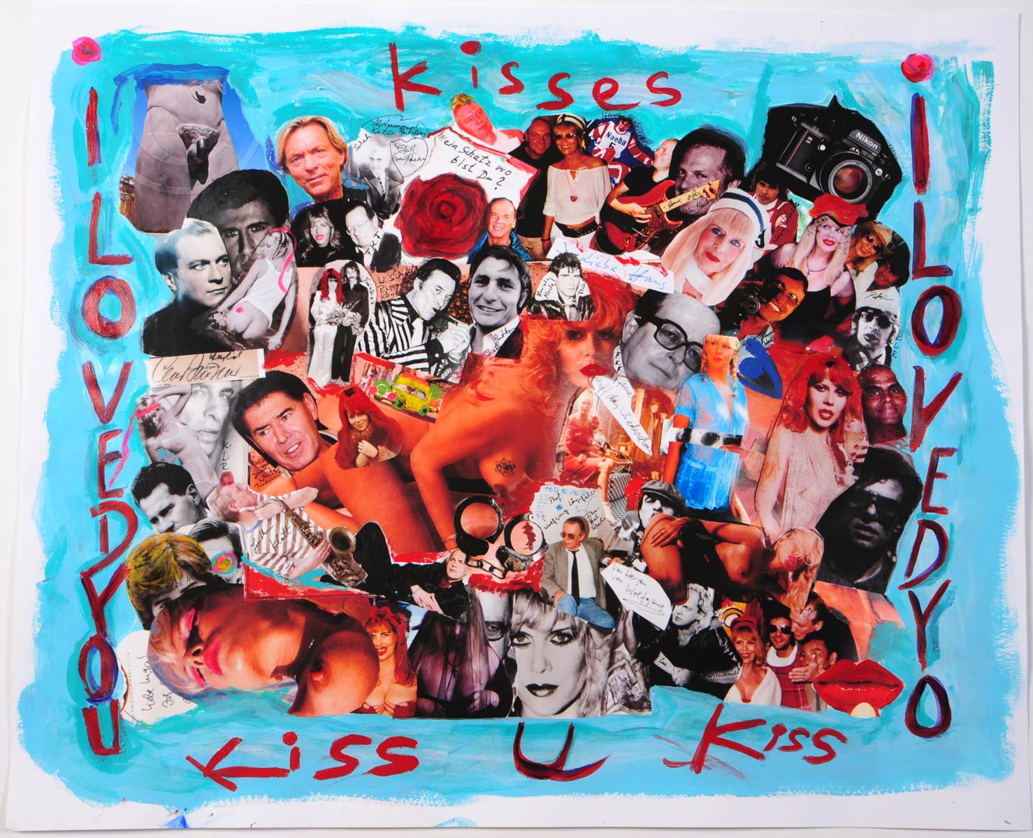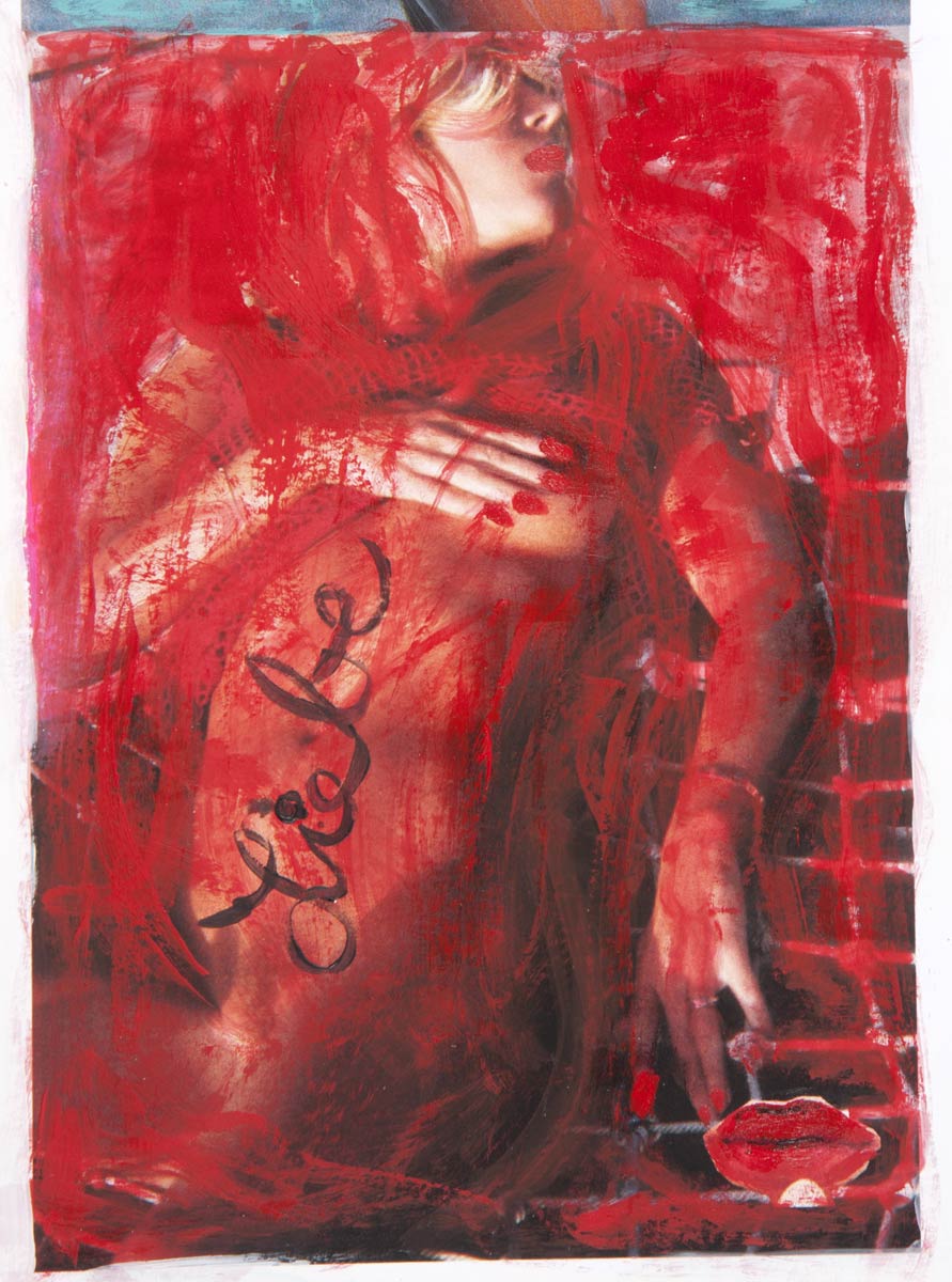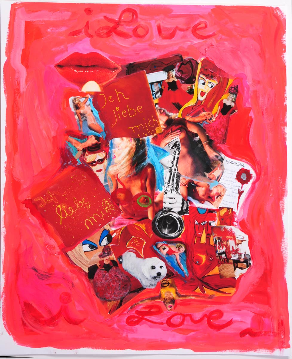 Alle Love 2024 Wilde Col­la­gen Moderne Über­la­ge­run­gen Blau Rot Gelb Expres­si­ve Ladies Por­traits im Auftrag Schwarz­weiss Schwarz­weiss-Redpink Taschen­bil­der