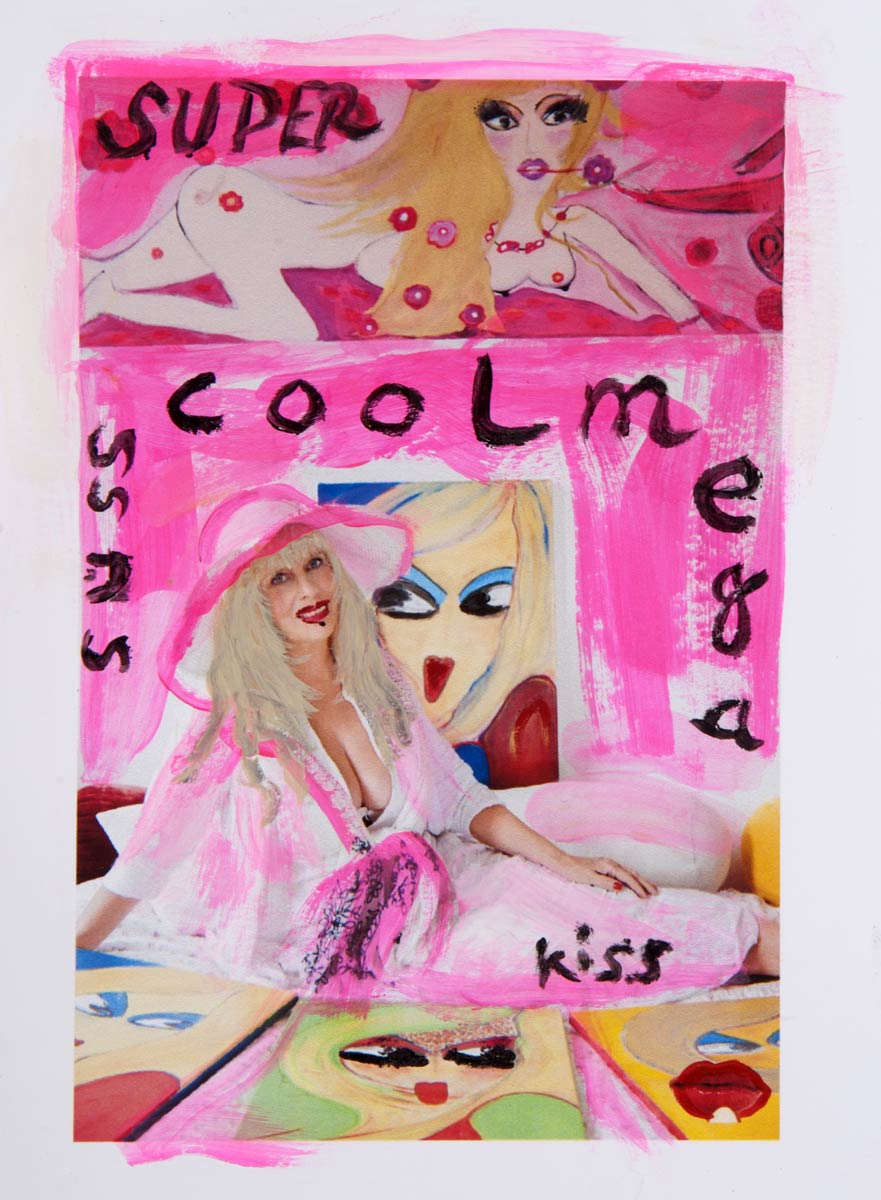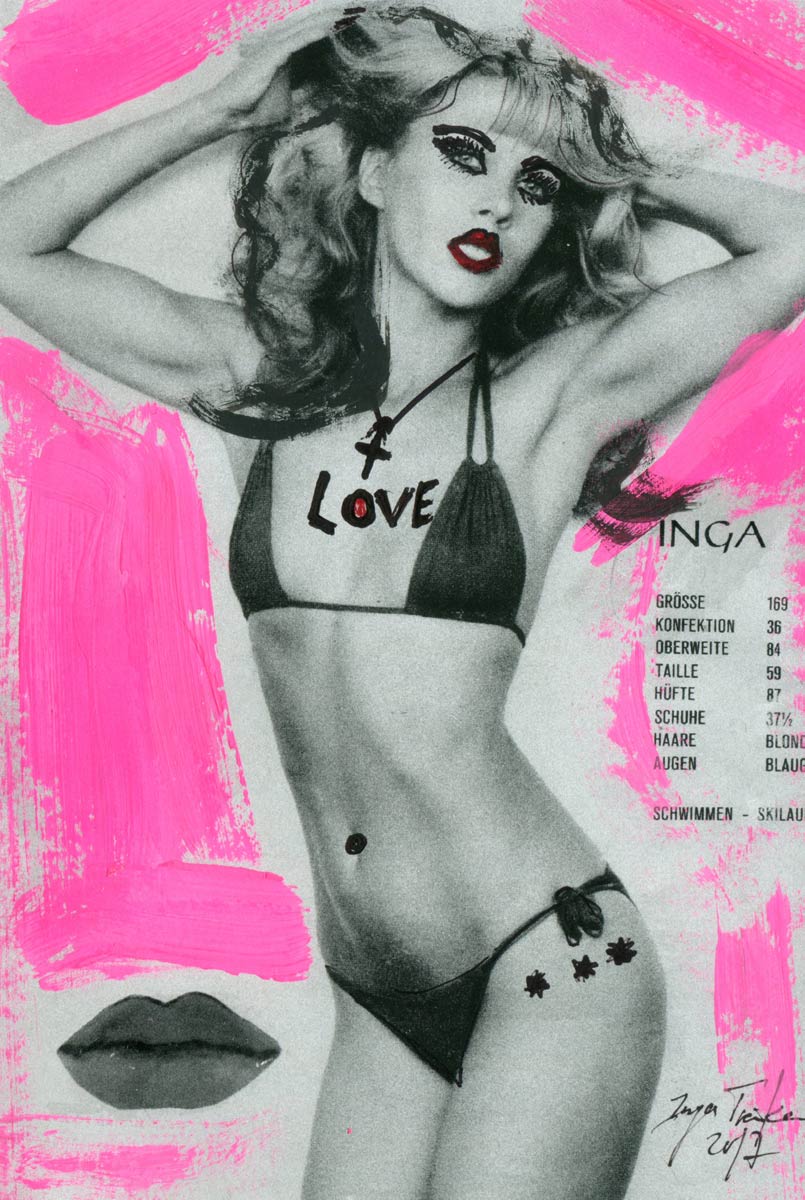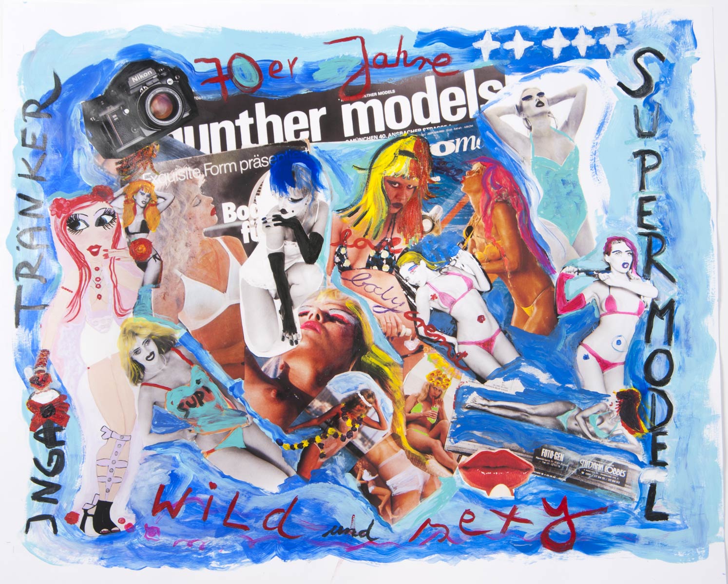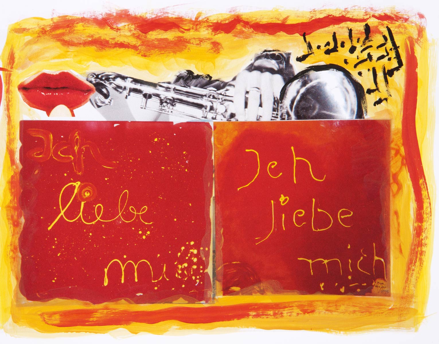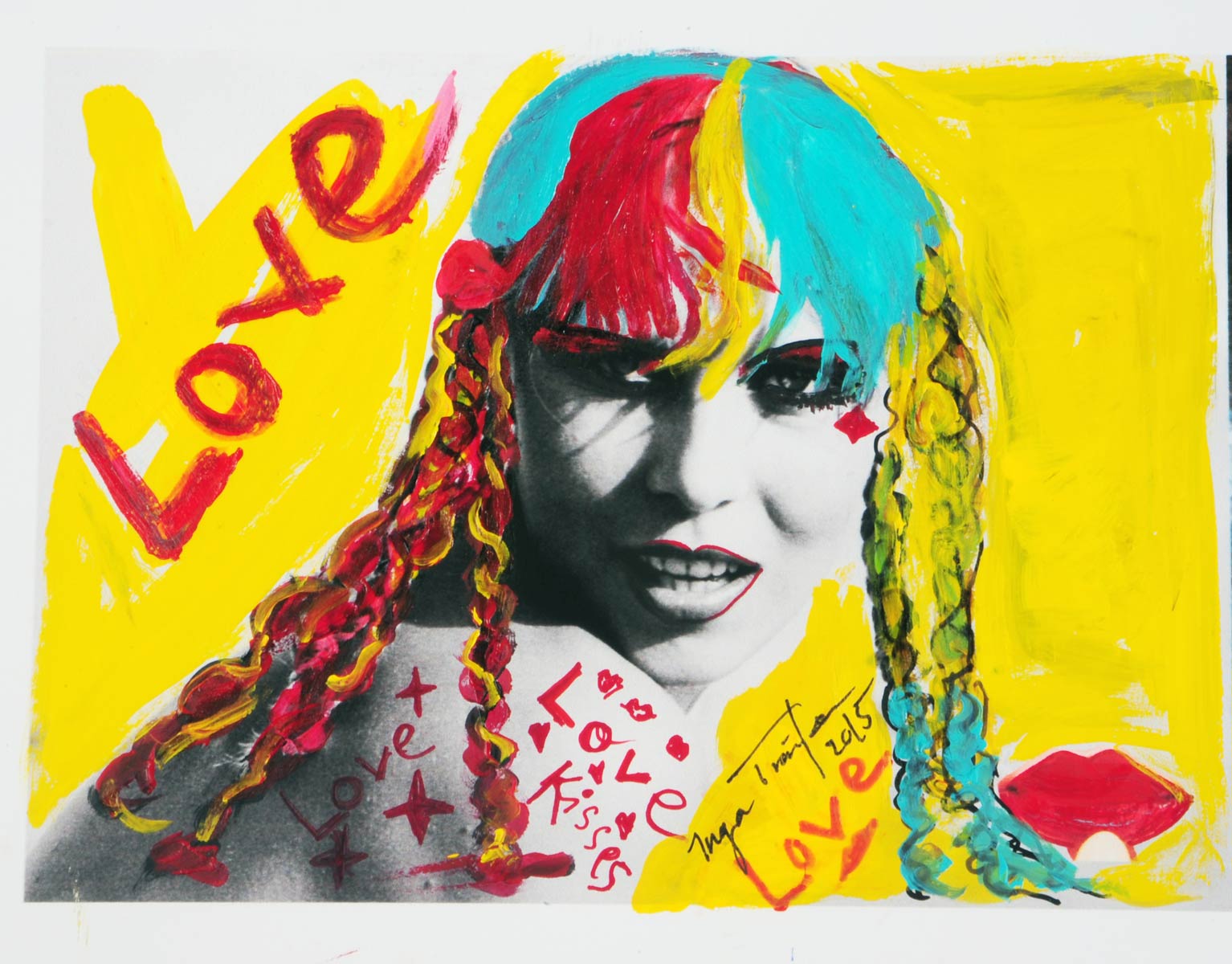 Alle Love 2024 Wilde Col­la­gen Moderne Über­la­ge­run­gen Blau Rot Gelb Expres­si­ve Ladies Por­traits im Auftrag Schwarz­weiss Schwarz­weiss-Redpink Taschen­bil­der